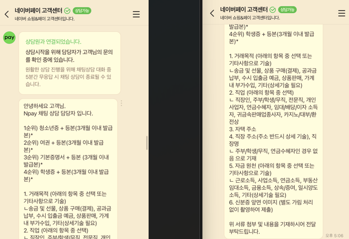 필요한 서류와 양식을 채팅으로 사진 찍어서 제출하시면 됩니다.