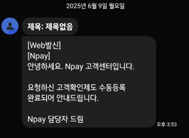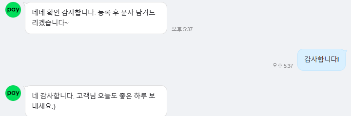 이후 며칠 기다리시면 네이버페이 담당자님이 수동으로 등록 후 문자로 알려주십니다.